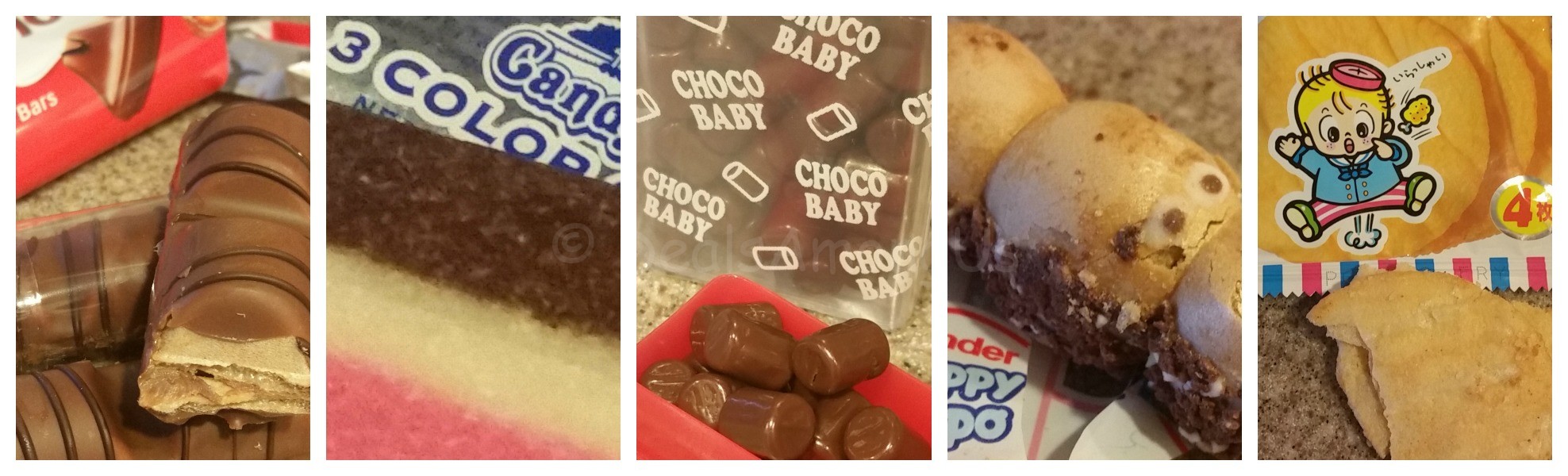 From Left to Right I received the Kinder Bueno which was a chocolate covered wafer with a smooth with a milky hazelnut filling which was very tasty and Jason and I devoured it. A Candy Farm 3 color Coconut Neapolitan candy bar which was a chewy gummy texture and was a coconut with each flavor of chocolate, vanilla and strawberry. Mejii Choco Baby’s which were little pellet of solid chocolate, Kinder “Happy Hippo” Cocoa Cream Biscuit’s which had a nice crunch and tasted of cocoa and a chip that resembled a fried french fries with a garlic and ginger flavor.
